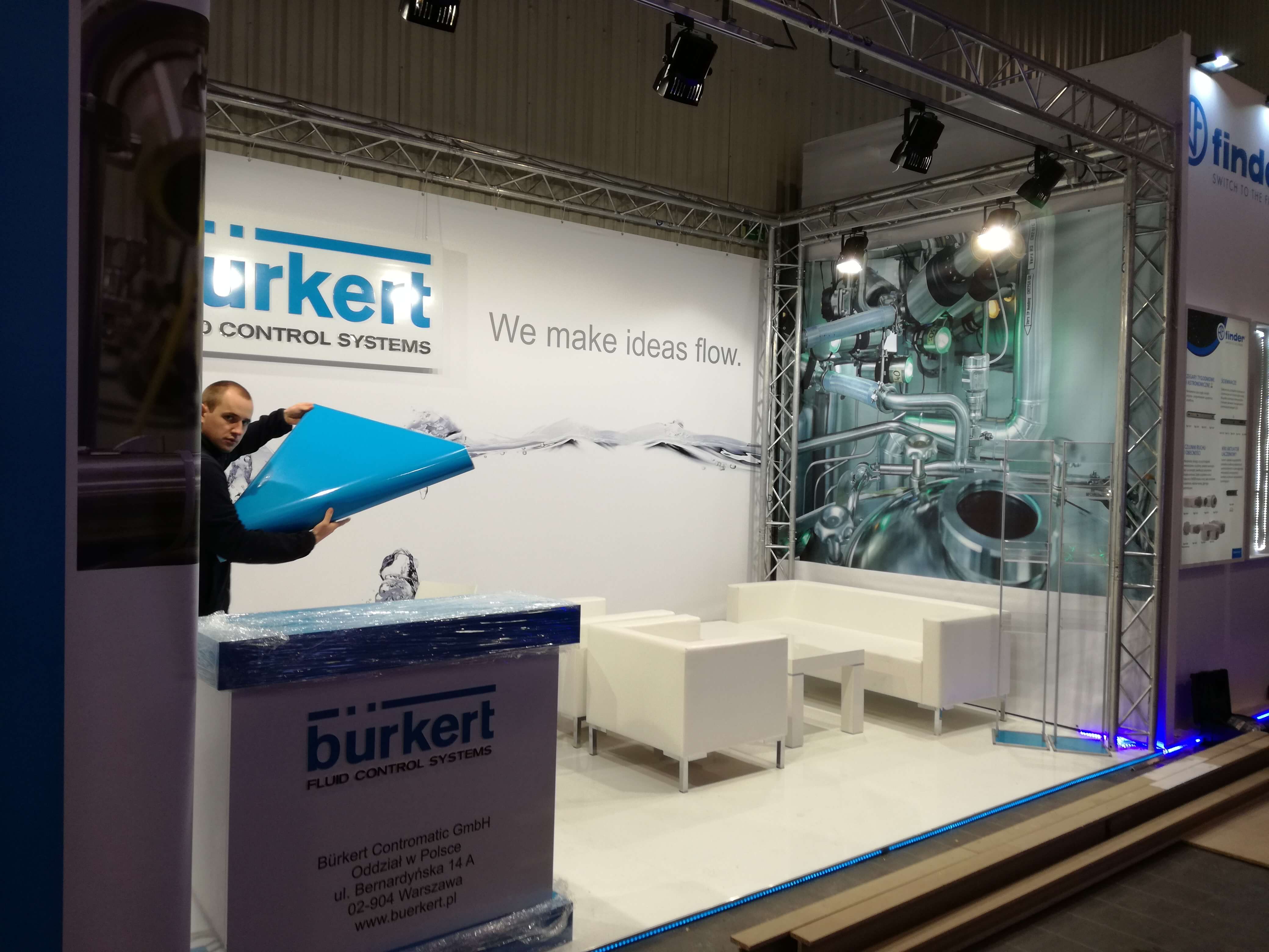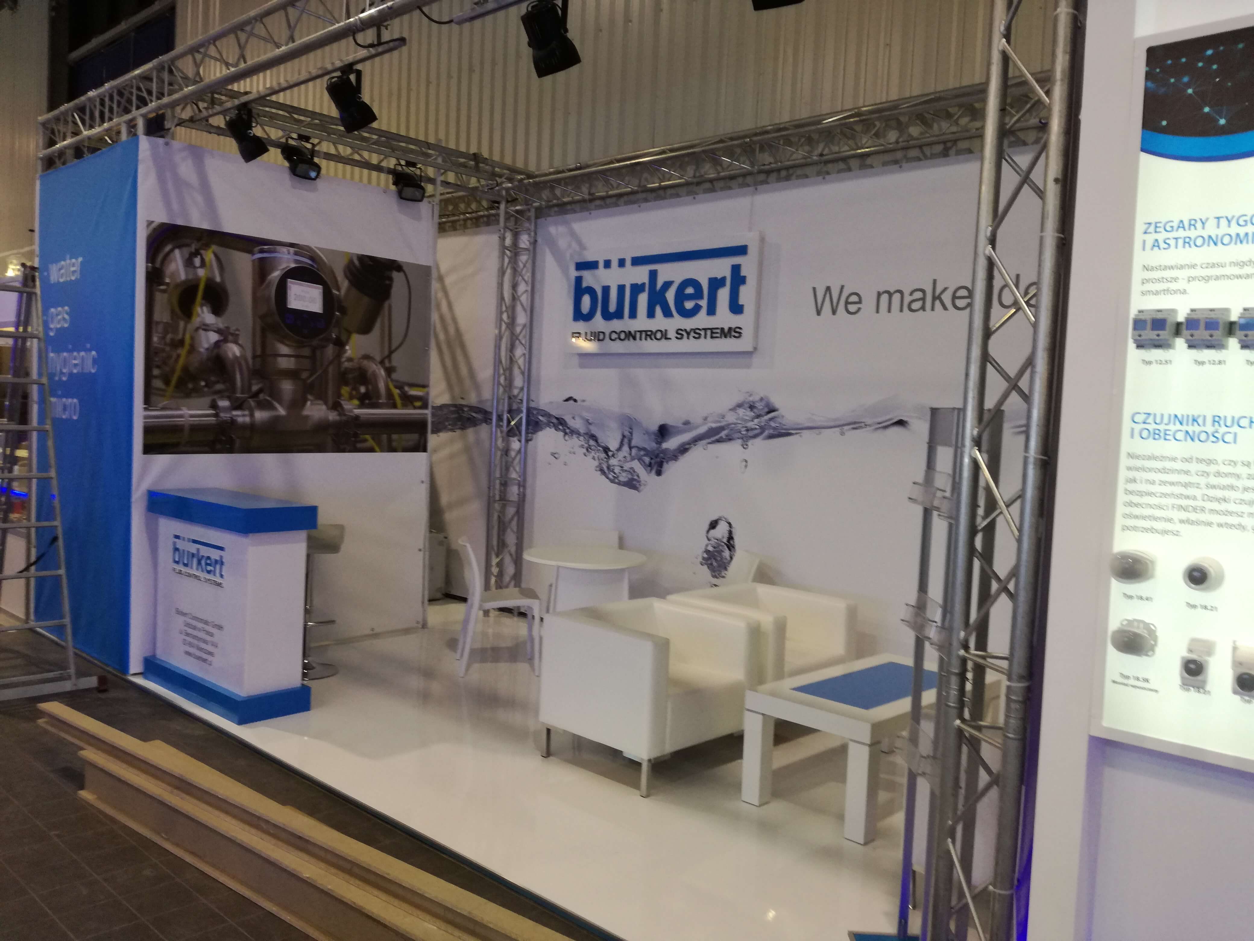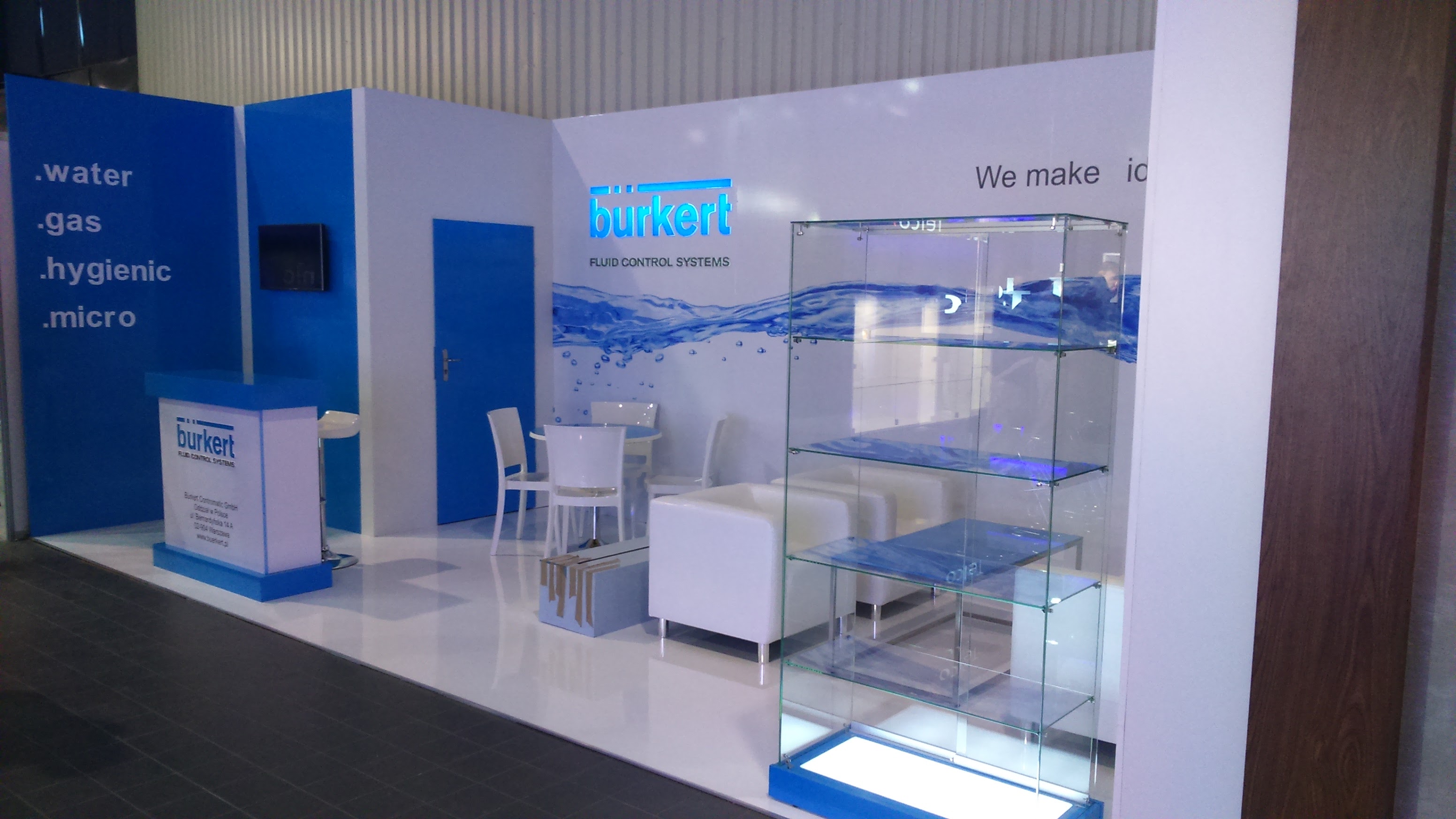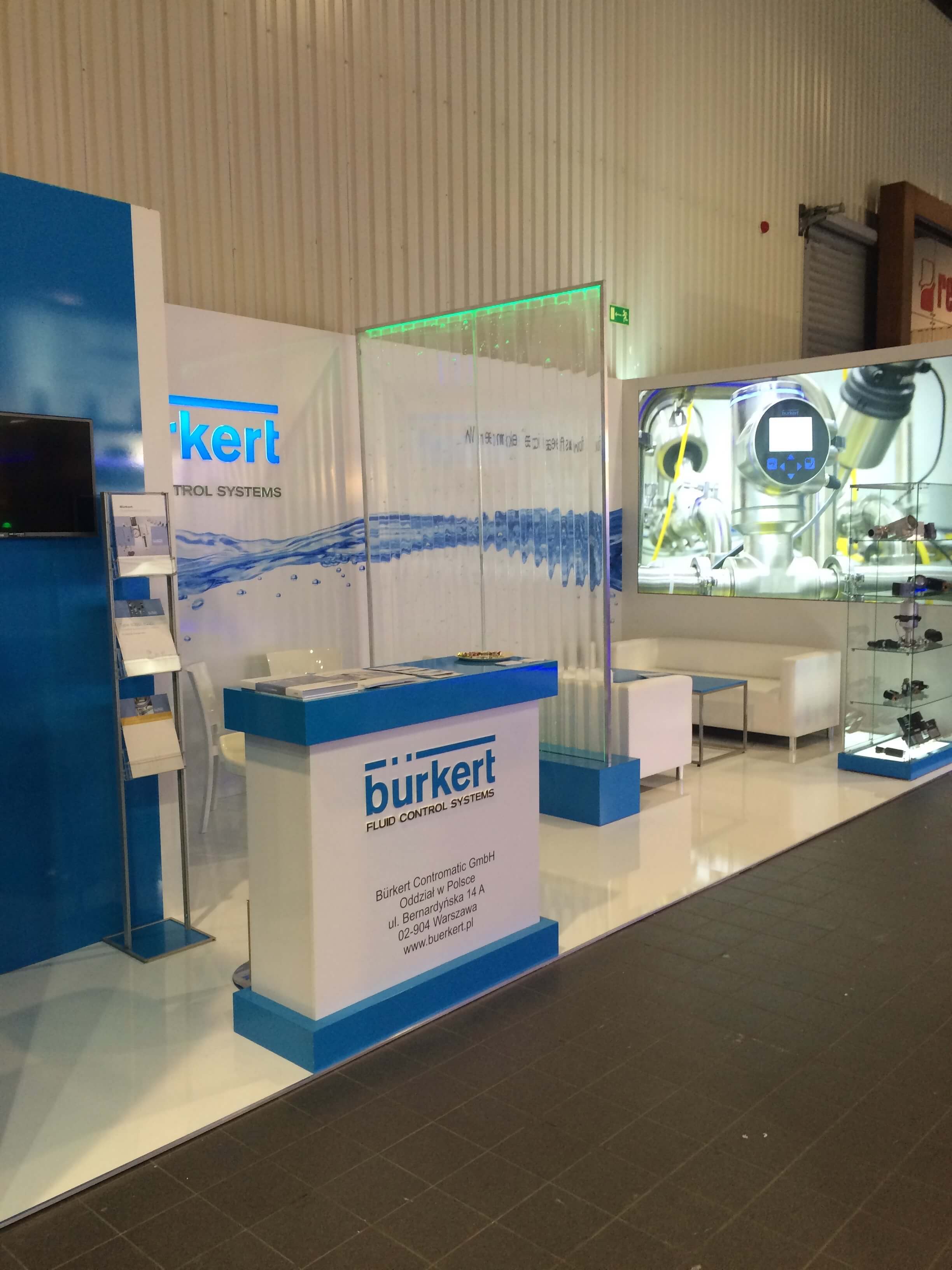 Projekt oraz realizacja stanowisk targowych dla firmy Burkert Fluid control System. W ramach tego projektu wykonaliśmy zabudowy stoiska targowego oraz wykonaliśmy instalację wodno-gazową podświetlaną diodami RGB nawiązującą do profilu działalności naszego klienta. Całość dała ciekawy efekt przepływającej wody w różnych kolorach. Na zlecenie Klienta wykonaliśmy również meble, gabloty ze szkła do ekspozycji produktów, wszystko zgodne z kolorystyką firmy Burkert oraz wpisujące się designem w charakter firmy. Cała aranżacja stanowiła spójną całość.
