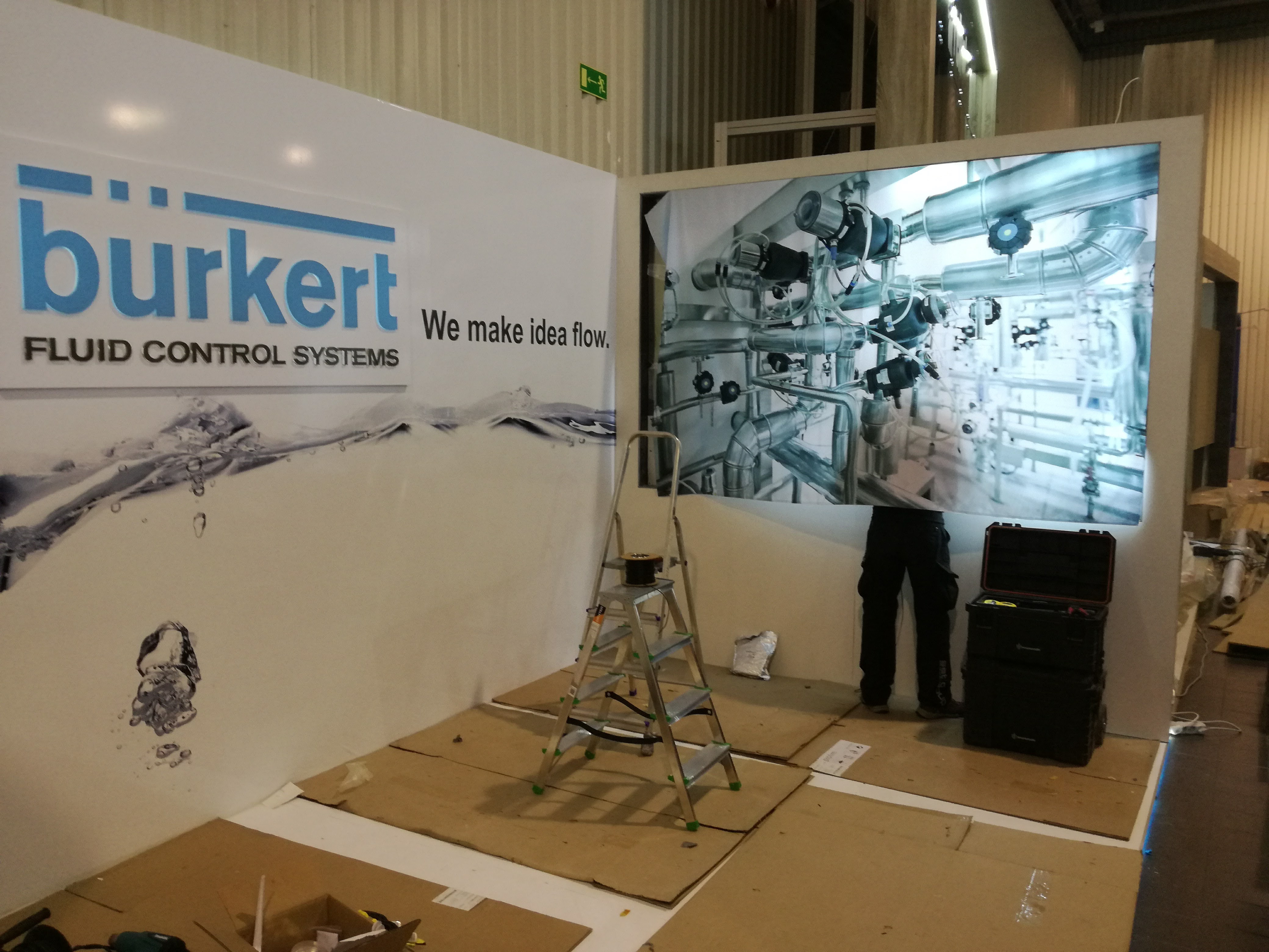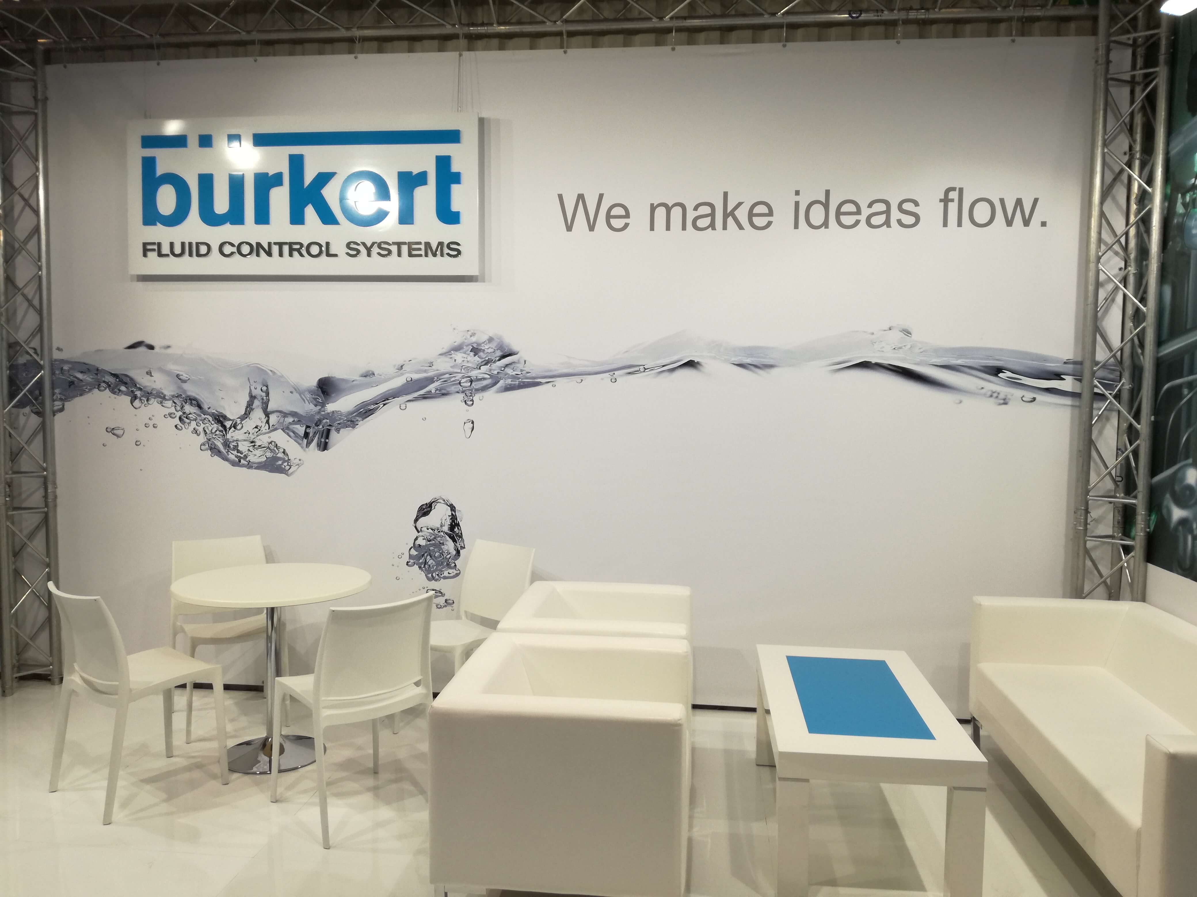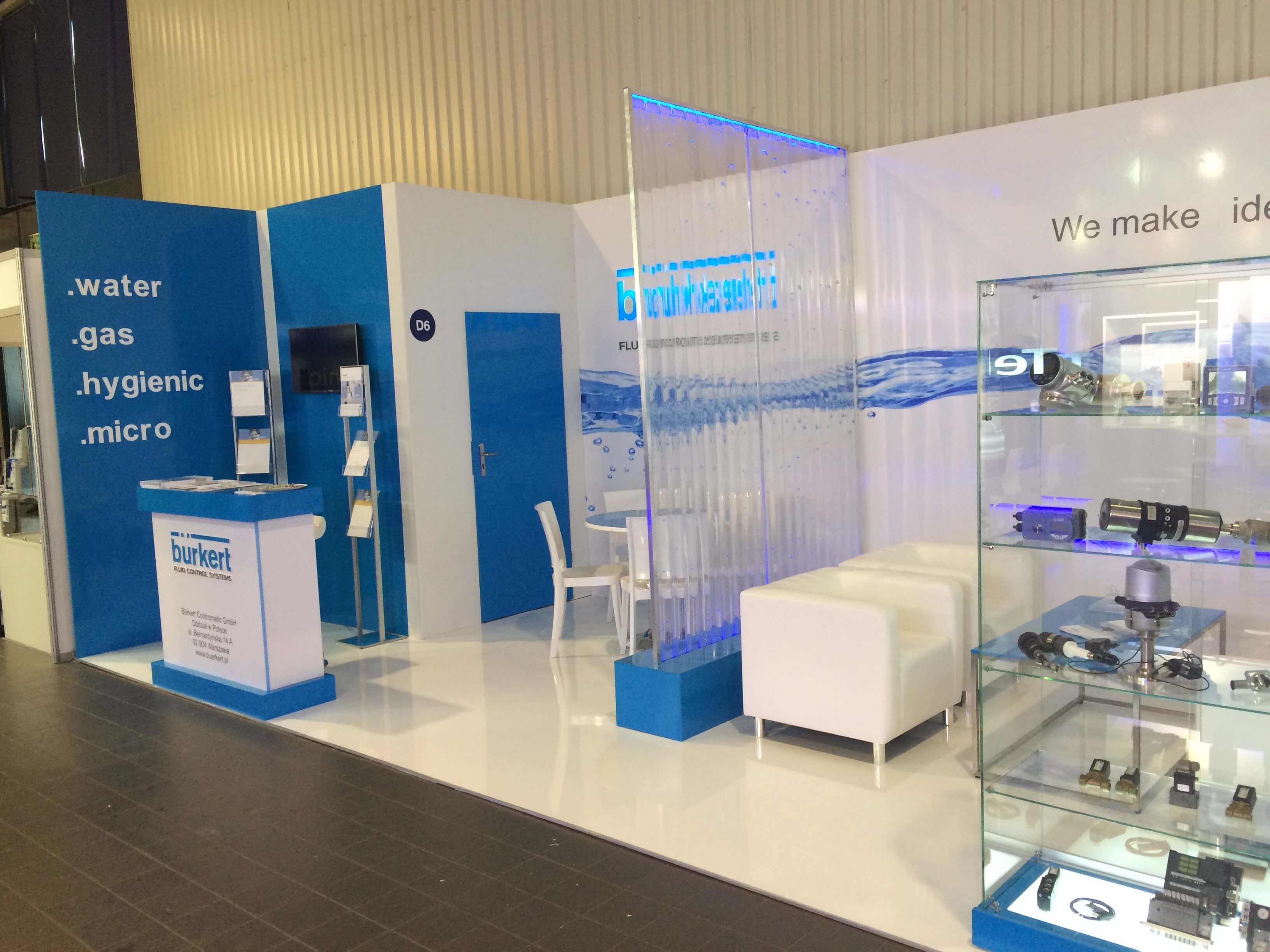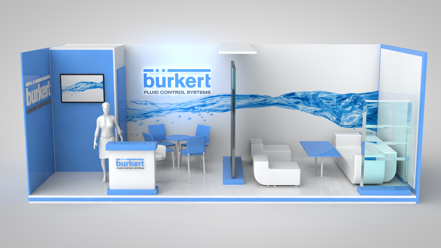 Projekt oraz realizacja stanowisk targowych dla firmy Burkert Fluid control System. W ramach tego projektu wykonaliśmy zabudowy stoiska targowego oraz wykonaliśmy instalację wodno-gazową podświetlaną diodami RGB nawiązującą do profilu działalności naszego klienta. Całość dała ciekawy efekt przepływającej wody w różnych kolorach. Na zlecenie Klienta wykonaliśmy również meble, gabloty ze szkła do ekspozycji produktów, wszystko zgodne z kolorystyką firmy Burkert oraz wpisujące się designem w charakter firmy. Cała aranżacja stanowiła spójną całość.