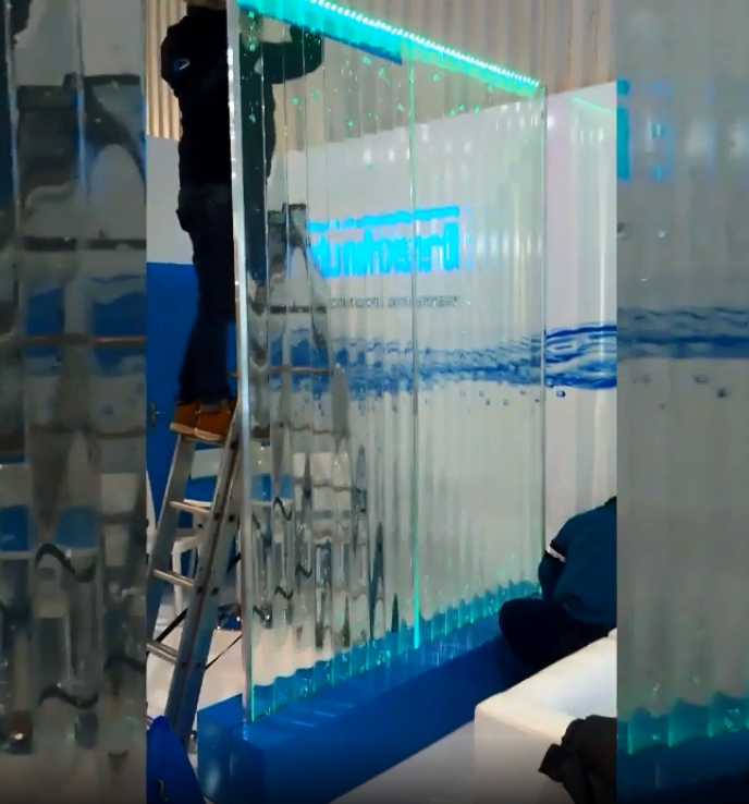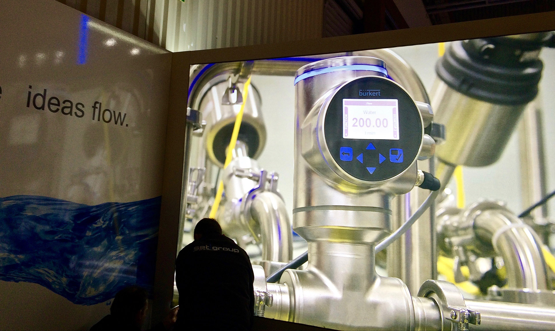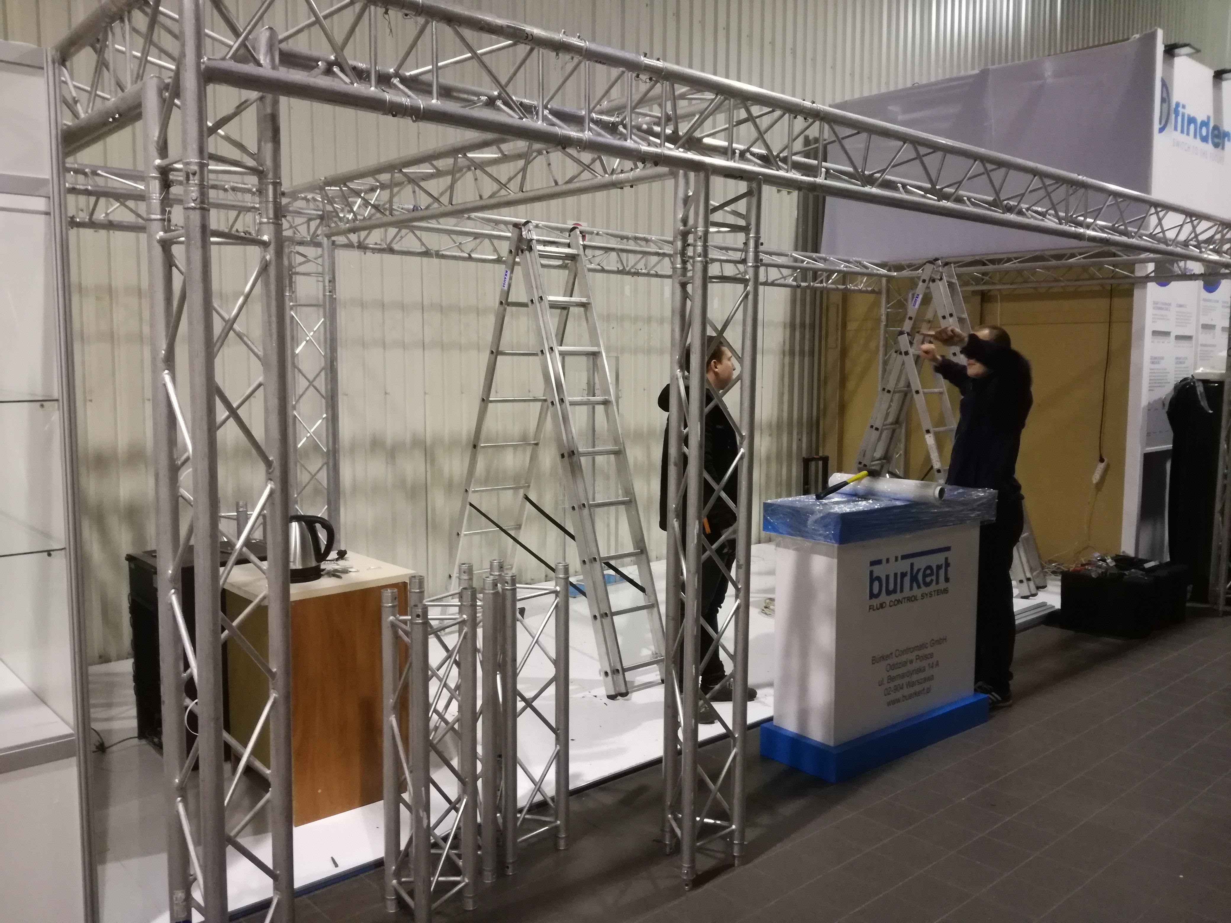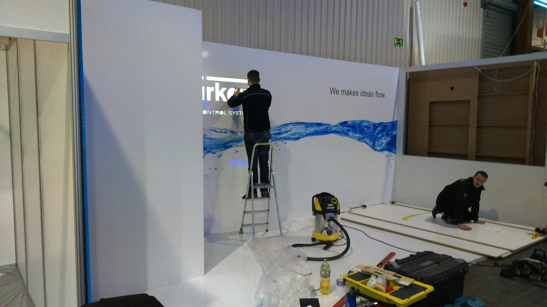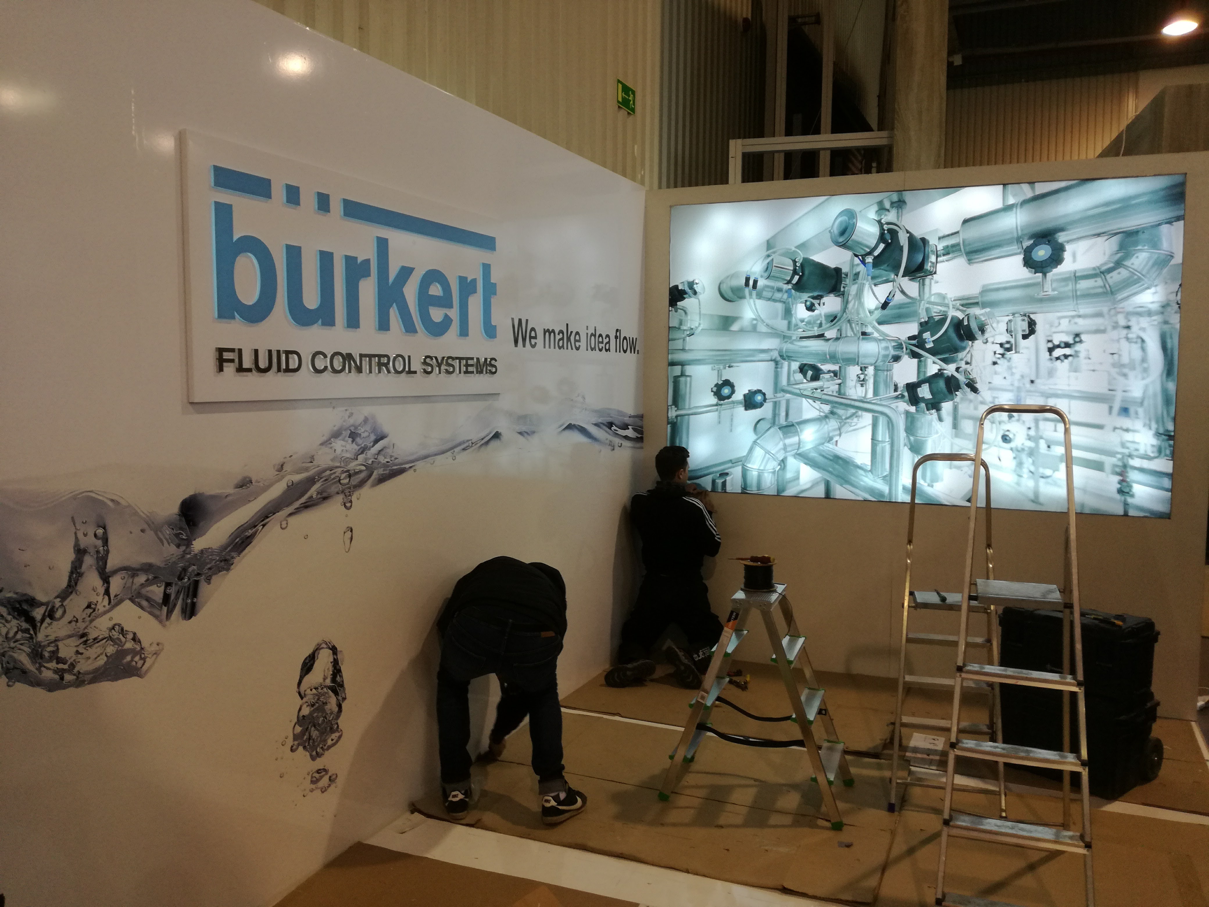 Projekt oraz realizacja stanowisk targowych dla firmy Burkert Fluid control System. W ramach tego projektu wykonaliśmy zabudowy stoiska targowego oraz wykonaliśmy instalację wodno-gazową podświetlaną diodami RGB nawiązującą do profilu działalności naszego klienta. Całość dała ciekawy efekt przepływającej wody w różnych kolorach. Na zlecenie Klienta wykonaliśmy również meble, gabloty ze szkła do ekspozycji produktów, wszystko zgodne z kolorystyką firmy Burkert oraz wpisujące się designem w charakter firmy. Cała aranżacja stanowiła spójną całość.