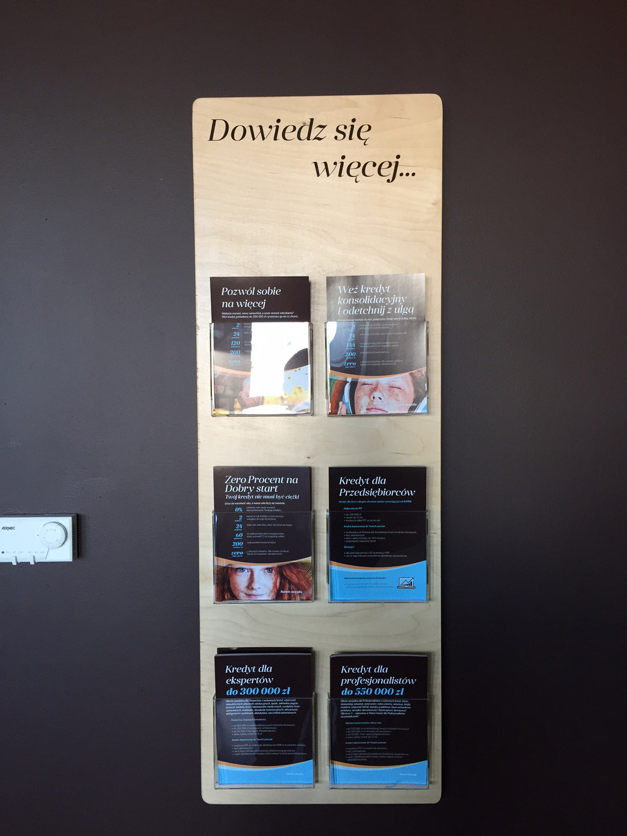 Nest Bank to kolejny Klient, dla którego mieliśmy przyjemność wykonać materiały oznakowujące jego placówki. Tym razem materiały były z drewna, plexi, folii drukowanej oraz barwionej w masie. Grafiki na ścianach były aplikacją z zadrukowanej folii, a tablice z plakatami wykonane zostały z grubej lakierowanej sklejki oklejonej wydrukiem na folii. Ponadto wykonaliśmy szereg posów tj. wizytowniki, podstawki na dokumenty itp. Wszelkie prace wykonywane były przez pracowników SET GROUP z najwyższą starannością co dało oczekiwany efekt. Monterzy SET GROUP dokonali instalacji materiałów brandingowych co automatycznie zapewniło Klientowi serwis na wypadek nieprzewidzianych usterek lub modyfikacji na życzenie Klienta.